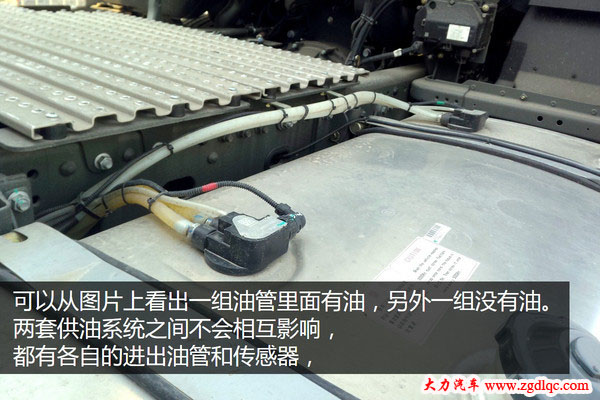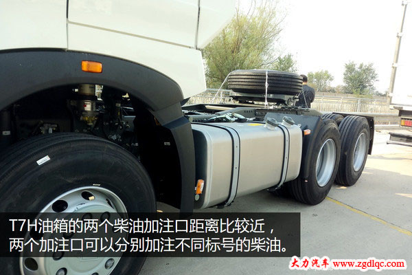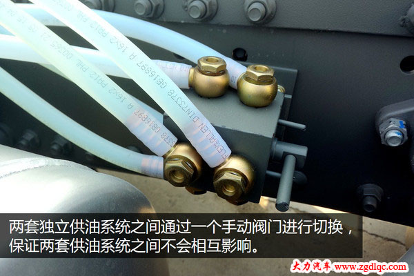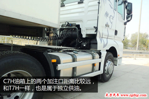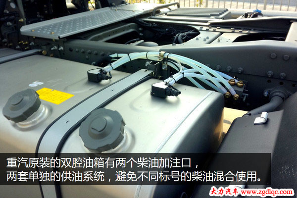 今日,大力汽車從中國重汽了解到,目前T7H和C7H都可以裝配雙腔油箱,通過一個簡單的控制閥門就可以實現(xiàn)兩個油箱之間的任意轉(zhuǎn)換。