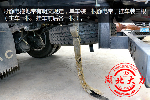 國家對危運車輛使用的導(dǎo)靜電拖地帶有明文規(guī)定,單車必須裝一根靜電帶,掛車裝三根(主車一根、掛車前后各一根),并要求所有的靜電帶空、重車和停駛都必須拖地。特別提醒:如果車身或車廂較長、較寬可根據(jù)實際需要多安裝一條或幾條導(dǎo)靜電拖地帶。