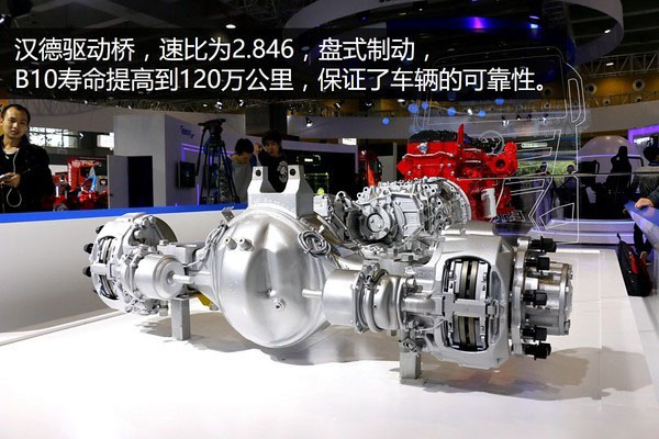 后橋?yàn)闈h德品牌驅(qū)動(dòng)橋,速比為2.846,制動(dòng)形式為盤式制動(dòng),剎車更加靈敏安全。另外該車的車橋B10壽命由60萬(wàn)公里提高到120萬(wàn)公里,保證了車輛的可靠性。