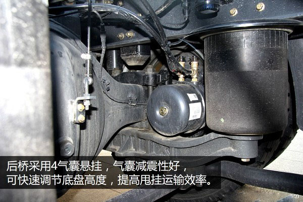 這款車型亮點(diǎn)之一后橋采用4氣囊懸掛,氣囊減震性好,一方面可以減少貨物顛簸,提高駕乘人員舒適性,另一方面通過(guò)ECAS系統(tǒng)可以快速調(diào)節(jié)底盤高度,能夠減少風(fēng)阻,提高甩掛運(yùn)輸裝卸效率。