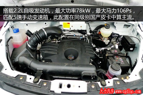在傳動(dòng)系統(tǒng)方面,該車搭載了一臺(tái)2.2L自然吸氣發(fā)動(dòng)機(jī),最大功率可達(dá)78kW,最大馬力106Ps,傳動(dòng)系統(tǒng)均匹配5速手動(dòng)變速箱,這樣的配備在同級(jí)別國(guó)產(chǎn)皮卡中頗為主流。