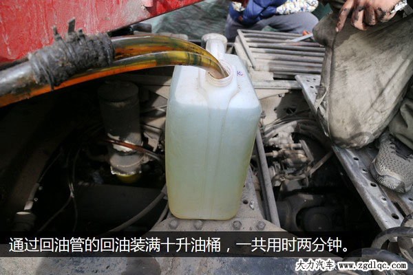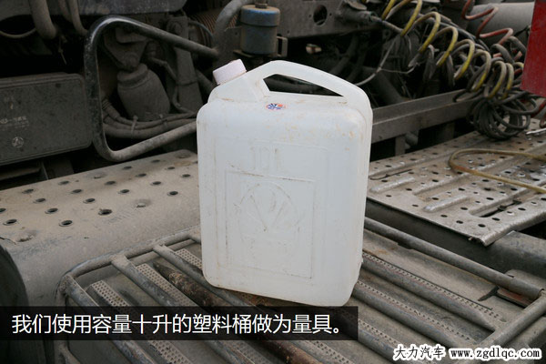 為了更直觀的進(jìn)行測(cè)試,我們選擇了一只容量為10升的塑料油桶作為容器,怠速運(yùn)行期間的燃料全部?jī)?chǔ)存在這里,可以把它理解為這輛卡車(chē)的一個(gè)油箱,只不過(guò)容量小一些而已。