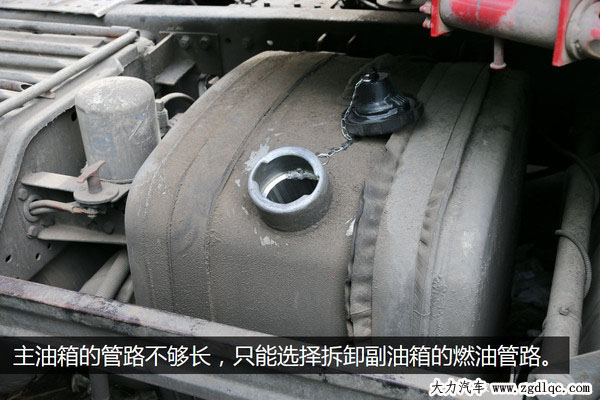 黃師傅的解放J6裝有一大一小兩個(gè)油箱,分為在車(chē)架的兩側(cè),一開(kāi)始我們選擇拆卸主油箱的出油和回油管,但是發(fā)現(xiàn)油管的長(zhǎng)度不夠長(zhǎng),所以只能選擇拆卸油管相對(duì)長(zhǎng)一點(diǎn)的副油箱油管來(lái)進(jìn)行測(cè)試。