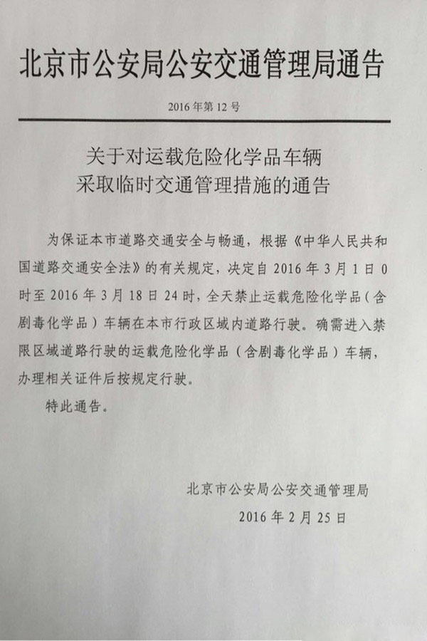 為確!皟蓵(huì)”期間交通秩序正常穩(wěn)定,保證城市道路交通安全與暢通,北京市決定于2016年3月1日0時(shí)至2016年3月18日24時(shí),全天禁止運(yùn)載危險(xiǎn)化學(xué)品(含劇毒化學(xué)品)車輛資本是行政區(qū)域內(nèi)道路行駛,確需進(jìn)入禁限區(qū)域道路行駛的運(yùn)載危險(xiǎn)化學(xué)品(含劇毒化學(xué)品)車輛,辦理相關(guān)證件后按規(guī)定行駛。