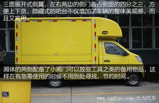 車身兩側(cè)還帶有隱藏式的吧臺,在售賣貨物的時候只需要將其向下拉即可使用,不僅方便而且還實用。在后輪的兩側(cè)增加了兩個工具箱,方便我們放些小東西,例如工具之類,這樣在遇到有需求的時候可以避免到處尋找。