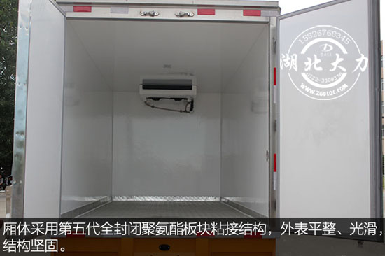 廂體厚度8厘米,內(nèi)外板材采用冷藏車專用玻璃鋼(可反射陽光),中間夾層為聚氨酯發(fā)泡隔熱材料(防火阻燃隔熱)真空復(fù)合三明治制板而成。底板為防滑鋁花紋板,廂內(nèi)帶有頂燈及防撞塊,設(shè)計(jì)貼心、用心。廂體后開門的門邊使用灰色膠條包邊處理,可以很好的防止冷氣外流。