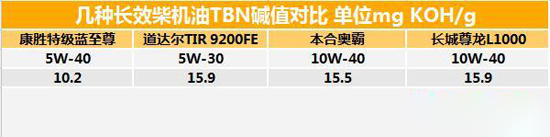 酸性氣體在柴油機(jī)工作過程中持續(xù)產(chǎn)生,所以機(jī)油什么時候酸化添加劑失效才是該換機(jī)油的重要指標(biāo)。所以長效機(jī)油的TBN(總堿值)都會調(diào)配的略高。那么說了半天,好像還沒講到這和加小油有什么關(guān)系,我們接著看這個表格。