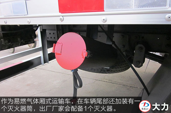 作為易燃?xì)怏w廂式運(yùn)輸車,在車輛尾部還加裝有一個滅火器筒,出廠廠家會配備1個滅火器,發(fā)生緊急情況時可救急使用。
