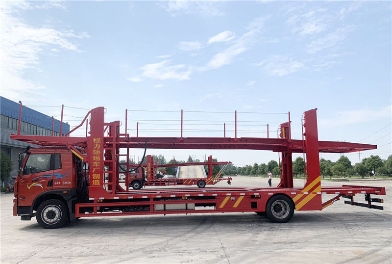 采用一汽解放的二類運輸車底盤,龍V2.0平頂半浮駕駛室,軸距7200,陜齒8檔變速箱,后橋435升級沖悍橋(速比4.444);錫柴六缸220馬力發(fā)動機,295/60R22.5輪胎,空調(diào),空氣彈簧座椅,電動門窗,電動舉升,300L鋁合金油箱,中控鎖,ABS,行車記錄儀(GPS+北斗),自主氣驅(qū)系統(tǒng)。上裝配置:全車高配10支油缸,上板標配凈長12米,下板凈長9.6米,下板板面離地高1米,上下板凈空間≥2米,國產(chǎn)液壓控制系統(tǒng),立柱為全低合金高強材料制作,其他材料為:Q235、Q345和HG70高強度國標鋼材。
