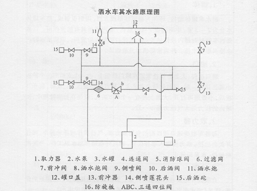 (4)作消防用:灑水車也通過本車水泵和消防接口作為應急消防用,其操作程序是在消防接口接消防設(shè)備,打開消防接口球閥,關(guān)閉球閥1和2,關(guān)閉其他灑水噴頭,將四位三通閥的標記擰到B位置,使 A-C相通,拉動取力器開關(guān),使水泵開始工作,此時即可通過消防接口向外提供消防用水。停止工作時各開關(guān)回位。