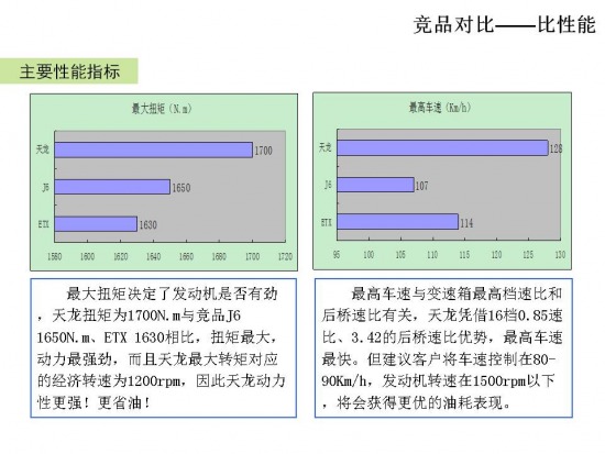 最大扭矩決定了發(fā)動(dòng)機(jī)是否有勁,天龍扭矩為1700N.m與競(jìng)品J6 1650N.m、ETX 1630相比,扭矩最大,動(dòng)力最強(qiáng)勁,而且天龍最大轉(zhuǎn)矩對(duì)應(yīng)的經(jīng)濟(jì)轉(zhuǎn)速為1200rpm,因此天龍動(dòng)力性更強(qiáng)!更省油!