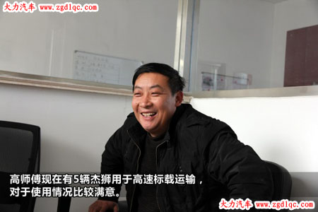 此次采訪的高師傅已經(jīng)擁有5輛杰獅了,配置均為380馬力發(fā)動機,法士特12檔超速檔變速箱,4.11速比后橋。高師傅第一次購買是在09年12月份,當時買的是一輛重載型藍色杰獅,2010年8月份買了一輛重載型紅色杰獅,用來拉17.5米平板車,在2010年11月份,又買了3輛杰獅輕量化車型。