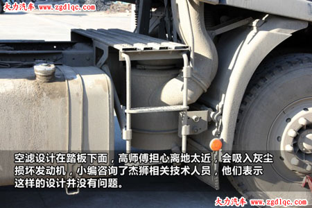 杰獅的使用情況高師傅可以說是比較滿意,不過他也跟小編說了一下他的擔憂,杰獅的空濾設(shè)計在踏板下面,離地比較近,高師傅擔心會吸入灰塵損壞發(fā)動機,小編咨詢了一下杰獅相關(guān)技術(shù)人員,他們表示,杰獅這樣的布置方式是沿用了依維柯Stralis的形式,在密封性上已經(jīng)做了相關(guān)的適應(yīng)性實驗,他們會考慮用戶的建議,做進一步的驗證,以保證車輛使用的穩(wěn)定性。