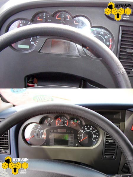 J6HC當(dāng)年的儀表臺(tái)是樣件,甚至沒有開皮紋。J6H采用與J6P一樣的儀表臺(tái),雖然套色的結(jié)構(gòu)拜托了中國(guó)重卡惡俗的仿桃木習(xí)慣,但藍(lán)灰的顏色搭配可能并不是最好的選擇吧。
