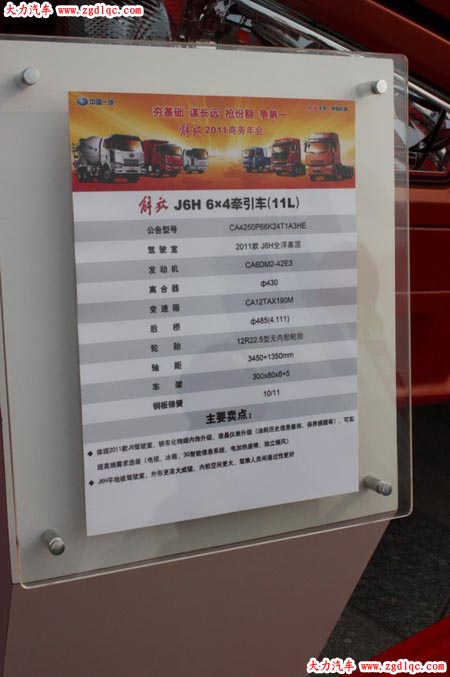 在2011年商務(wù)年會(huì)上,解放展示了作為即將在2011年量產(chǎn)的平地板J6,配置與2010年北京車展上的J6P平地板牽引車相同。而這次的命名,既不是“J6升級(jí)版”,也不是“J6P平地板”,而是回歸了他本來的名字“J6H”!