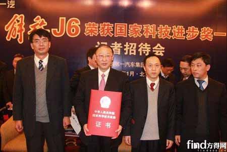 2011年1月14日,北京人民大會堂,在國家科學(xué)技術(shù)獎勵大會的頒獎儀式上,中國一汽“高品質(zhì)J6 重型車及重型柴油機自主研發(fā)與技術(shù)創(chuàng)新”項目,獲得了2010年度國家科學(xué)技術(shù)進(jìn)步獎一等獎。中國第一汽車集團(tuán)公司技術(shù)中心主任、項目第一完成人李駿博士代表獲獎團(tuán)隊上臺領(lǐng)獎。