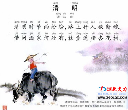 清明,農(nóng)歷二十四節(jié)氣之一。中國(guó)傳統(tǒng)的清明節(jié)大約始于周代,距今已有二千五百多年的歷史!稓v書》:“春分后十五日,斗指丁,為清明,時(shí)萬物皆潔齊而清明,蓋時(shí)當(dāng)氣清景明,萬物皆顯,因此得名。”清明一到,氣溫升高,正是春耕春種的大好時(shí)節(jié),故有“清明前后,種瓜種豆”。清明節(jié)是一個(gè)祭祀祖先的節(jié)日,主要是掃墓,掃墓是慎終追遠(yuǎn)、敦親睦族及行孝的具體表現(xiàn)。清明節(jié)是在仲春與暮春之交,也就是冬至后的106天。2006年5月20日,該民俗節(jié)日經(jīng)國(guó)務(wù)院批準(zhǔn)列入第一批國(guó)家級(jí)非物質(zhì)文化遺產(chǎn)名錄。另,詠清明詩極多,杜牧《清明》詩最為著名。