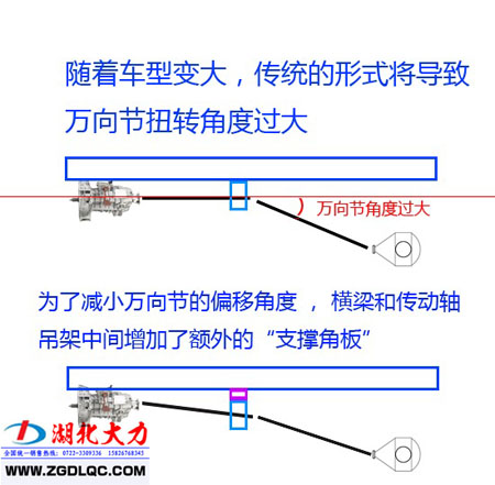 上圖即為傳動(dòng)軸中間支承的附加角板,減小了萬向節(jié)的夾角,這一布置形式已為我們所常見。