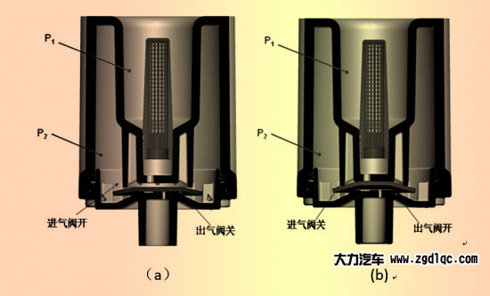 當油水分離器處于向制動系統(tǒng)增壓供氣時,圖(a), 油水分離器(p1)處氣壓增加,從而打開進氣閥膜片, 壓縮空氣將通過進氣閥門并被儲存在油水分離器收集腔 (p2)中,直到膜片兩邊恢復到壓力平衡,此時進氣閥門膜片將關(guān)閉。